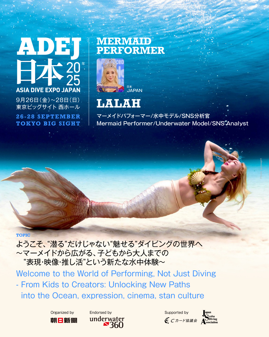 2025年9月26日(金)〜28日(日)、東京ビッグサイトで開催される 「ADEJ(Asia Dive Expo Japan 2025)」 にて、プロフェッショナルマーメイド・LALAH(ララァ)が登壇します。