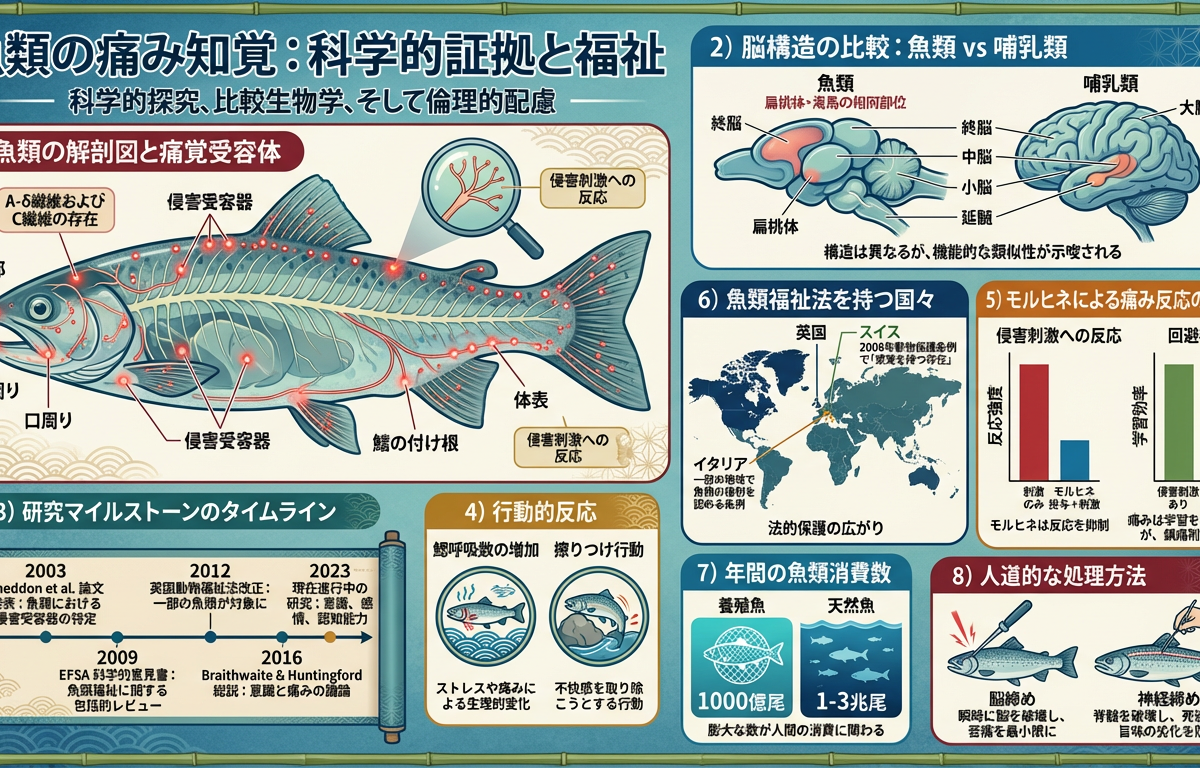 目次1 違和感を感じ始めました2 科学が明らかにした真実:魚は痛みを感じる3 「痛み」の定義をめぐる議論4 世界の動き:動物福祉法の進展5 日本の「鮮度信仰」の背景6 人道的な処理方法の模索7 数字で見る現実8 文化か残酷か?──この問いにどう向き合うか9 私たちにできること10 おわりに:変わりゆく倫理観...