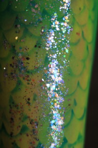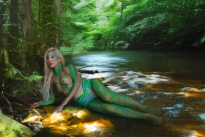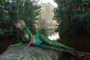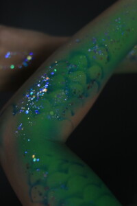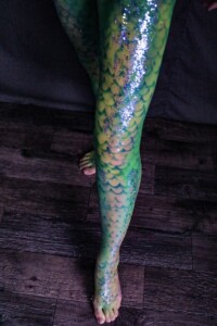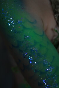 人間がマーメイドに変身するのは簡単ではありません。水中でのマーメイドスイムでは泳ぎの優雅さで人魚らしさを表現できますが、陸上撮影ではどうしてもコスプレ感が強くなりがちです。陸上での人魚感を増すために、一般の方でも鱗型のペイントシールや網タイツを使ったウロコメイクなどの簡単なメイクを利用し、人魚の雰囲気を表現しています。