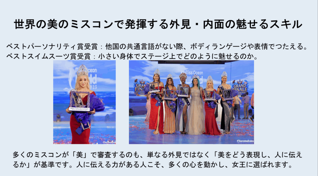 多くのミスコンが「美」で審査するのも、単なる外見ではなく「美をどう表現し、人に伝えるか」が基準だからです。