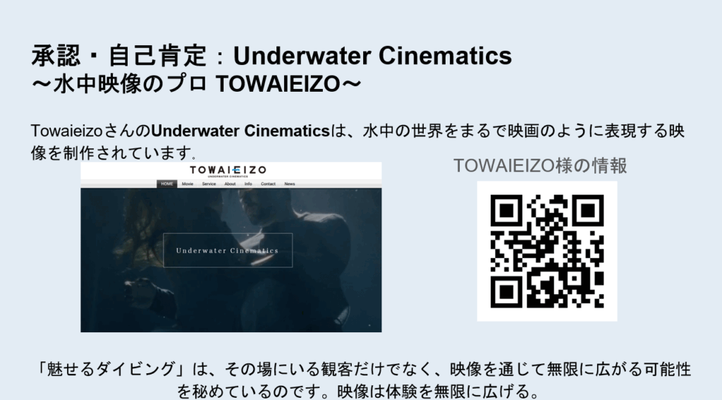 私もご一緒したTowaieizoさんのUnderwater Cinematicsは、水中の世界をまるで映画のように表現する映像を制作されています。